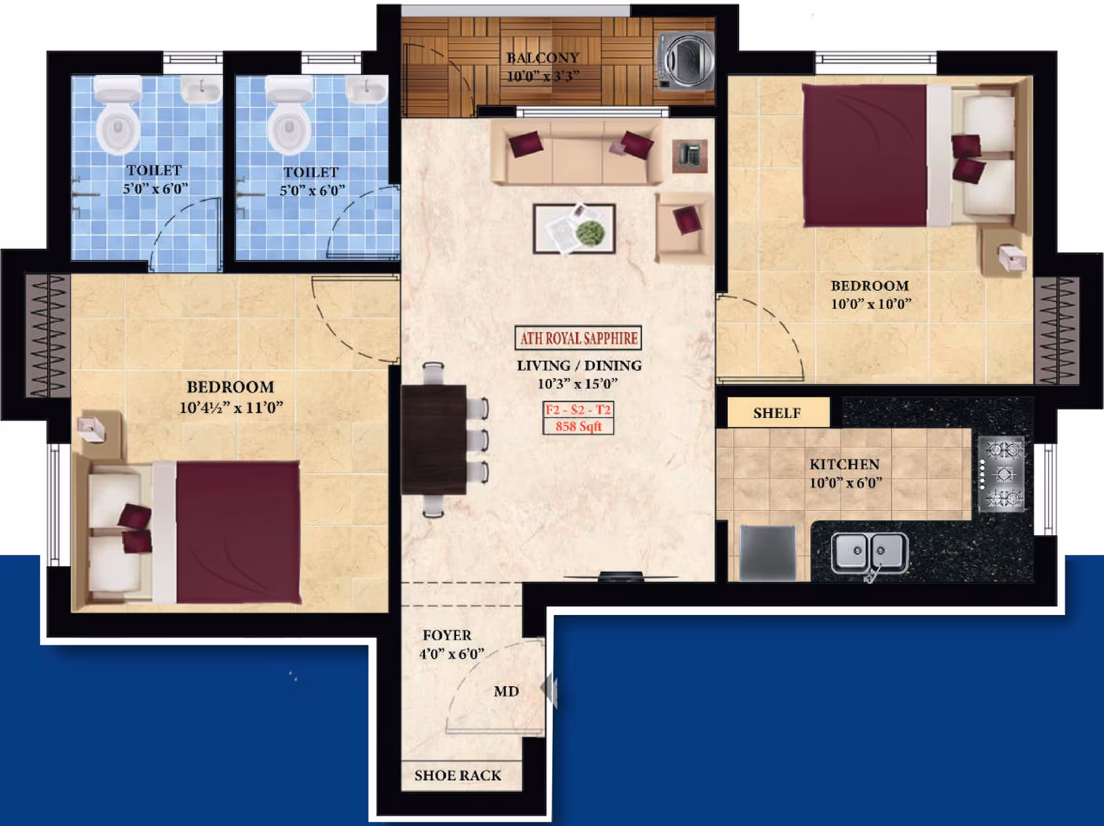 ATH Royal Sapphire is a nice project that offers apartments in Pammal. A rapidly developing residential locality that boasts wonderful connectivity and the finest infrastructure. Promoted by the well-known Asset Tree Homes this project is entirely made of well-planned 2 & 3 BHK, these flats wonderfully boast 100% vasthu compliant plans for a harmonious lifestyle. Totally this single tower building comprises 6 apartment units with a carpet area ranging from 858 - 1213 Sq.Ft. Each resident enjoys his very own car parking space on the stilt floor and also many more nice facilities like lifts, CCTV surveillance and so on. Come on check out this premium property in Pammal.