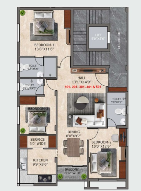 Unit sizes of the Greenwich Tivoli ranges from 1189 - 1413 Sq.Ft .
