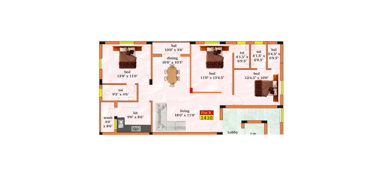 Unit sizes of the KF Vaishnavi ranges from 1410 Sq.Ft .