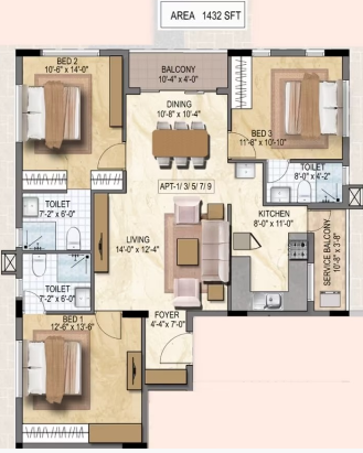Unit sizes of the Kriya Winchester ranges from 1241 - 1432 Sq.Ft .
