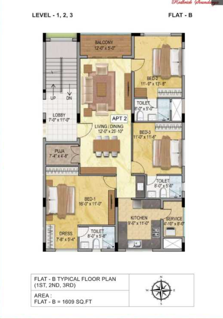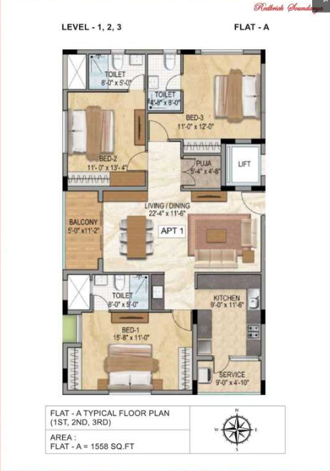 Redbrick Soundarya is a sleek ultra-modern apartment in Adyar. One of Chennai's city's most loved affluent residential neighbourhoods is served by top amenities. Developed by Redbrick Realtor this is a low-rise apartment that's entirely configured as 3 BHK units with lift access. Most importantly they are all opulently planned with a unit size ranging between 1558 - 1609 Sq.Ft. With a beautiful brick facade, this building boasts an elegant finish and totally offers 6 apartments for sale. Planned as a nice stilt plus 3-story block there are 2 apartments on each floor. Each flat enjoys its very own balcony and covered car parks. Come check out these premium apartments in a prime locality.