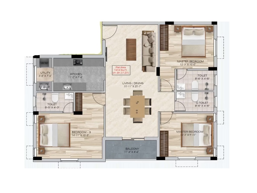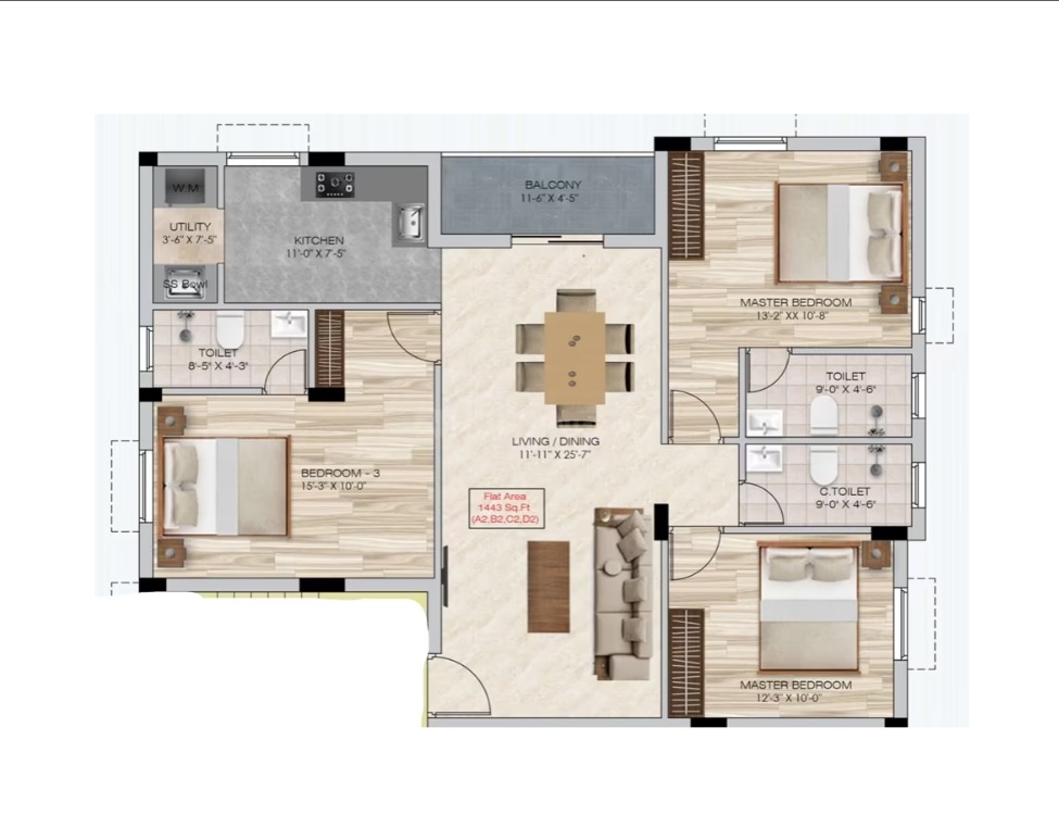 Unit sizes of the Sai Ganesh ranges from 1414 - 1443 Sq.Ft .